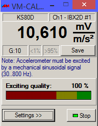 The calibration information is then immediately available to all instruments. The accelerometer must be excited by a sinusoidal calibration signal in the range between 30 .. 800 Hz. The levels of several calibration sources are preset. Additionally, an individual level can be defined.