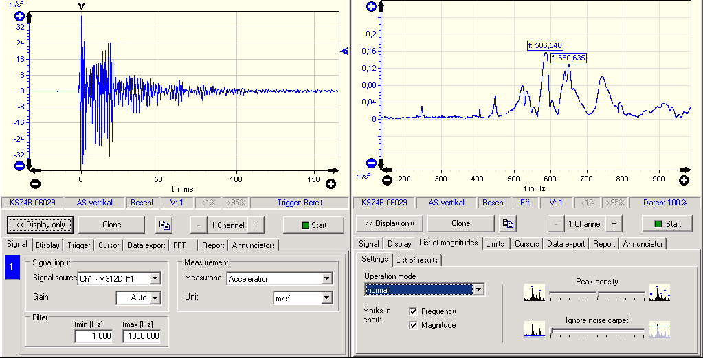 The connection between VM-SCOPE and VM-FFT (if licensed) is established by clicking the button Switch on frequency analysis or the button Switch on FRF. This copies the data of the VM-SCOPE after a trigger event and calculates and displays the frequency spectrum or the frequency response function.