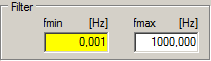 For special analysis, it can be useful to set the the limit frequencies in the bandpass filter beyond the corner frequencies of the measurement hardware. In this case, VibroMetra will allow the bandpass filters for fmin to be below the lower limit frequency of the measurement hardware. In this case, the input field will be colored yellow as a warning.