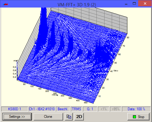Apart from frequency analyses (manual settings), bearing diagnoses can be performed and spectra of acoustic values can be displayed with VM-FFT 3D. It can always be chosen between waterfall diagram (3D) and frequency spectrum (2D).