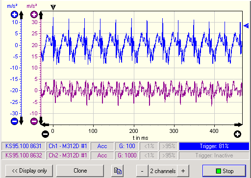 Apart from displaying the vibration signals over time, the orbit mode allows displaying signals of two channels compared to each other in a scatter (X-Y) plot.