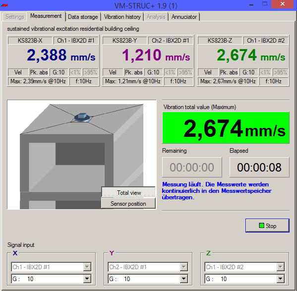 VM-STRUC measures to DIN 4150-3. This standard considers both sustained and short-time vibration.
