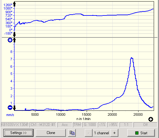 The typical application of VM-TRACK is finding resonances and the rotation speeds when they occur. For this purpose rotation is started up to the nominal rotation speed. During this startup process VM-TRACK measures magnitude and phase of the vibration signal at the rotation frequency or its multiples. The same measurement can also be performed during coast-down. From the measured diagram you can quickly determine resonances.